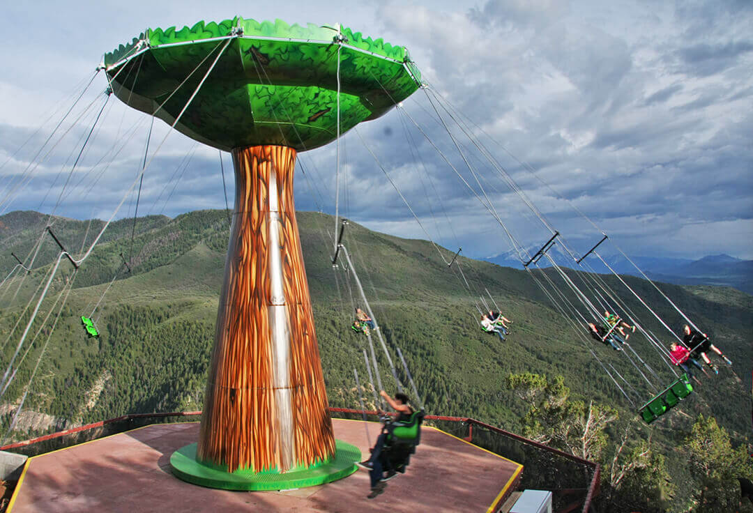 The Glenwood Canyon Flyer is perched on the edge of Glenwood Canyon, right between the Giant Canyon Swing and the Cliffhanger Roller Coaster.